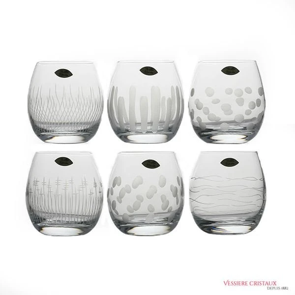 Coffret de 6 gobelets, taillés main. Une taille différente est réalisée sur chaque verre. Une fabrication Française, réalisée près de Sarrebourg.
