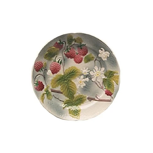 Assiette à dessert framboise en Faïence de Barbotine, une assiette aussi bien décorative qu’utilitaire. Également disponible avec le motif abricot, pomme, prune, poire, raisin, orange, framboise.