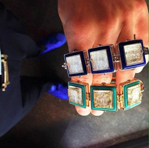La célèbre collection Aréthuse, motif « Masque de Femme », dévoile le visage d’une femme symbolisant la nymphe Aréthuse, coiffée d’une faune aquatique. Bracelet en vermeil, motifs en cristal incolore, laque de couleur turquoise et corail. Découvrir la collection Aréthuse.
