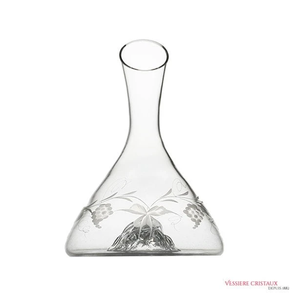 Une carafe à vin esthétique et originale. Avec un taille serment, le décor de raisin et feuille gravé à la main entoure la carafe. Une grappe de raisin est moulée sur la base de la carafe, apportant ainsi un relief à l’intérieur. Une fabrication Française, réalisée près de Sarrebourg (Lorraine).