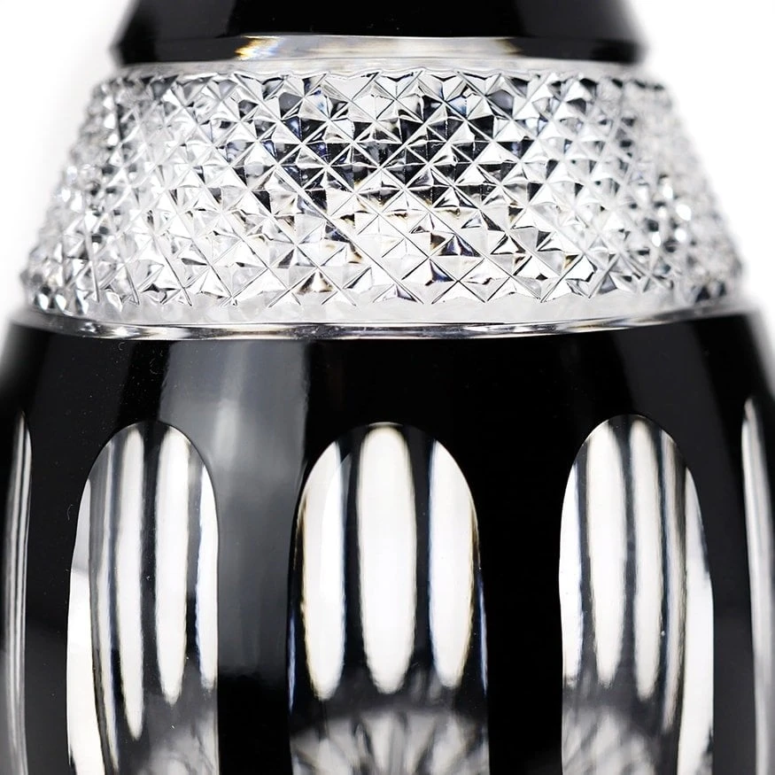 Carafe de la collection Pénombre en cristal clair et noir. Offrant un belle masse de cristal, le travail de taillage est sublime. Du pied au bouchon, Cristal de Paris met en avant son savoir-faire ainsi que sa spécialité. Découvrir le Service Pénombre.