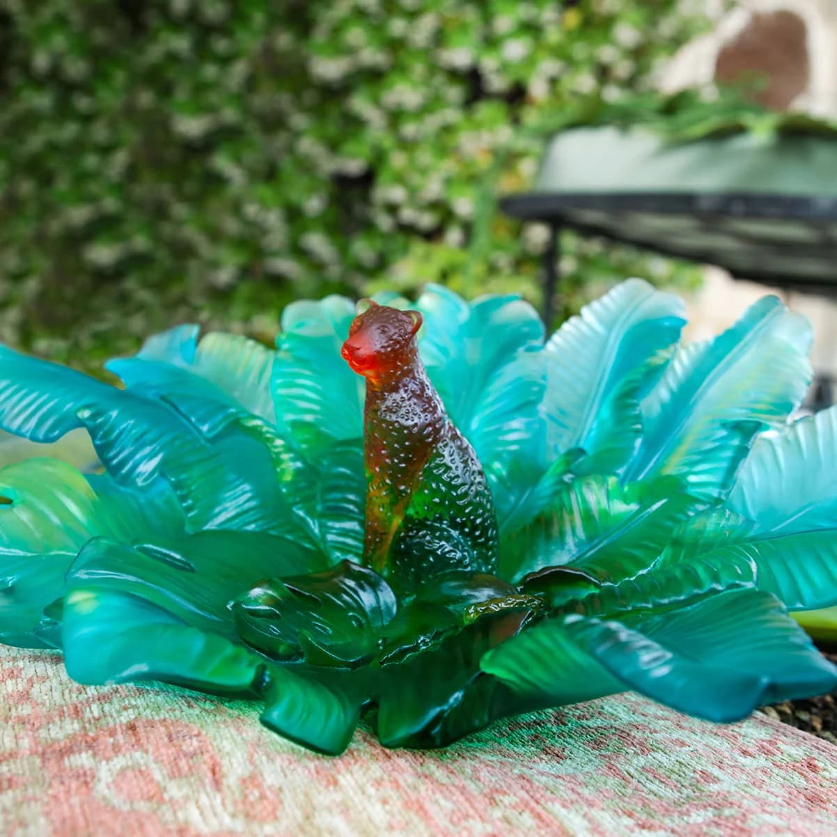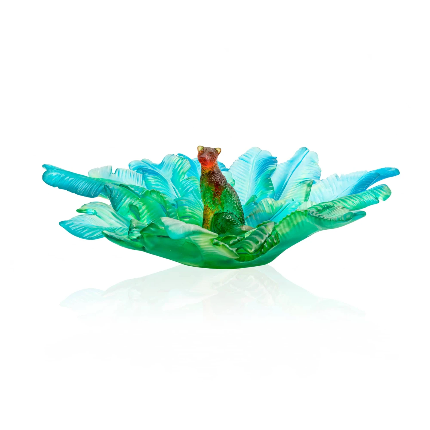 La cristallerie Daum nous ravit avec cette pièce au caractère exceptionnel. Le léopard est tapi au centre de feuilles de bananier. Subtilement ambré, il est mis en valeur au cœur de la pièce.