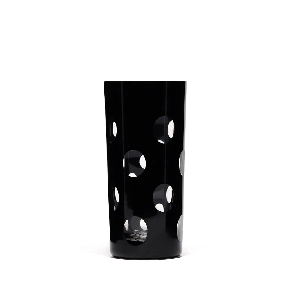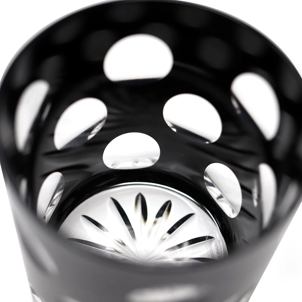 Le service Pastille créé par Cristal de Paris met à l’honneur le cristal noir. Ce motif de taille creuse circulaire crée un effet d’optique cinétique très typique du XXe siècle. On appréciera le travail de taille au niveau de la base.