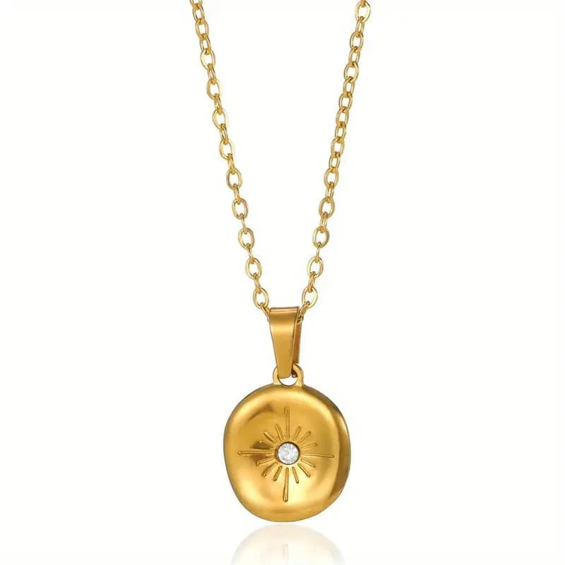 Le collier « Soleil d’Hélios » est une célébration du divin, inspiré par le dieu grec du soleil. Sa médaille polie jusqu’à obtenir un éclat miroitant, arbore un cristal central qui scintille tel un rayon de lumière pure.