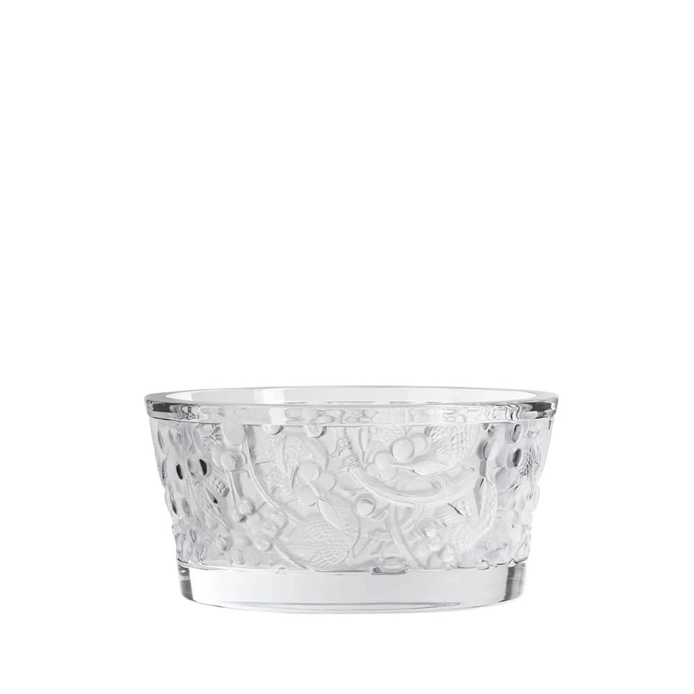 En 1928, René Lalique crée les panneaux décoratifs Merles & Raisins, à l’origine en verre blanc pressé sur un fond argenté, pour orner les marqueteries en acajou de Cuba du mythique Orient Express. Le Studio Lalique réinterprète aujourd’hui cette création iconique et lui donne une nouvelle expression à travers des vases et une coupe. Le précieux héritage culturel de la Maison prend ainsi vie sur des formes très contemporaines.