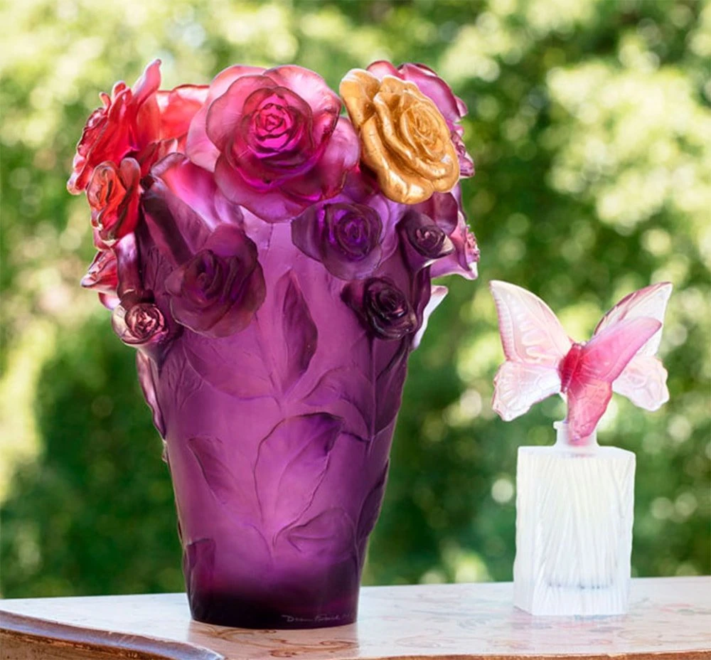 Plus qu’un flacon de parfum, cette pièce constitue un véritable objet de décoration. Symbole de métamorphose et de transformation, les papillons en pâte de cristal imaginés par l’Atelier Daum représentent la liberté et l’épanouissement. Les papillons arborent de larges ailes déployées finement sculptées, aux teintes parme et rose.