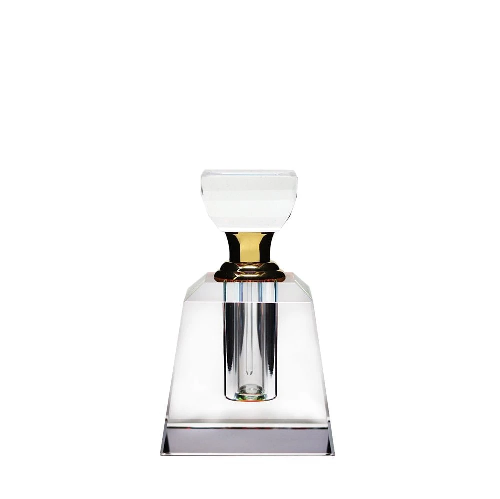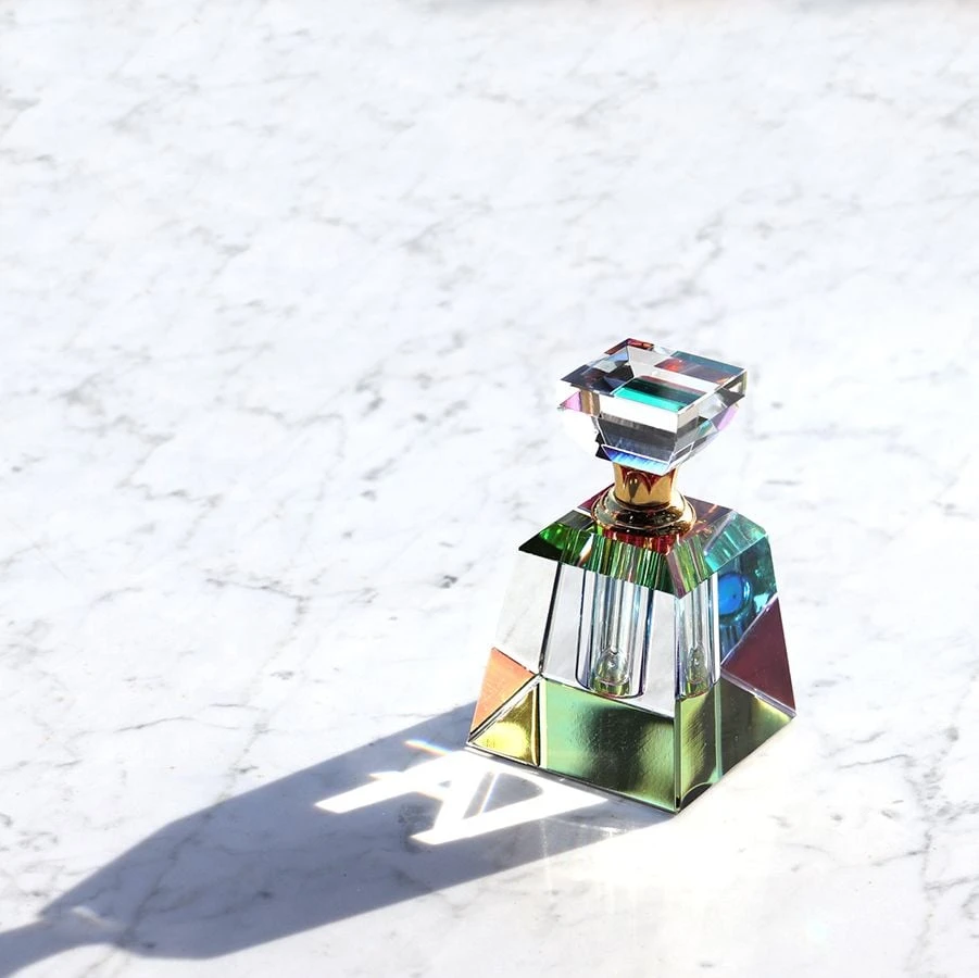 Subtil et délicat, ce flacon en cristal aux formes géométriques est sublimé par une taille du cristal nette et précise. Réalisé entièrement en cristal clair, on y découvre des effets de couleurs variant suivant la position du flacon. Une feutrine noire placée sous le flacon donne ces reflets multicolores au cristal. Insérez quelques gouttes de votre meilleur parfum à l’intérieur, une tige en cristal vous permet de déposer cette subtile fragrance sur les endroits souhaités.