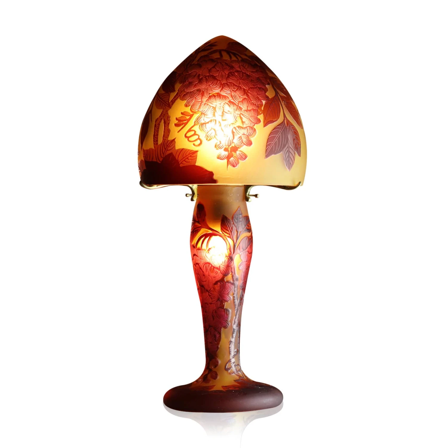 Symbole de la Période Art Nouveau, ces lampes sont des créations du même style que celles d’Emile Gallé. Le verre multicouche, travail à chaud, est une superposition par cueillage successif de couches de verre de couleurs différentes. Dans un premier temps, l’artiste fait le dessin du décor. Ce dessin devient ensuite un motif décoratif qui est appliqué sur la pièce afin de reproduire l’ornementation. À l’aide d’un vernis, l’ouvrier recouvre les parties de la pièce à protéger de l’attaque de l’acide. La pièce peut ensuite être travaillée de différentes façons, au pinceau ou plongée dans un bain.