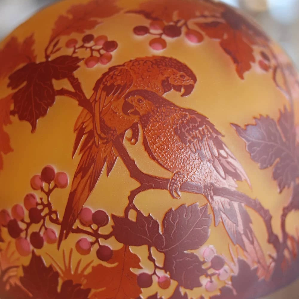 Symbole de la Période Art Nouveau, ces lampes sont des créations du même style que celles d’Emile Gallé. Le verre multicouche, travail à chaud, est une superposition par cueillage successif de couches de verre de couleurs différentes.