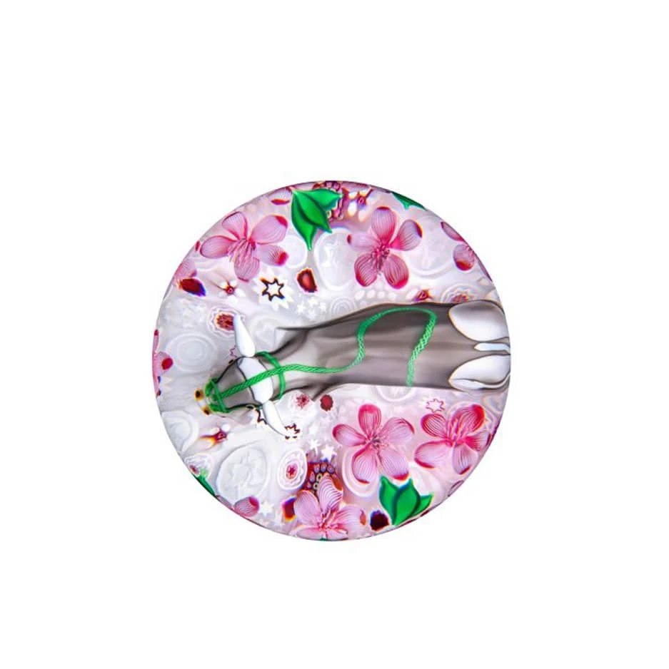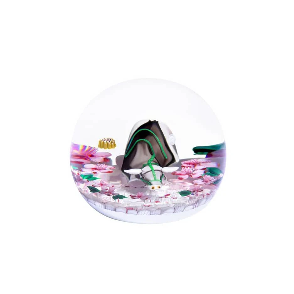 Un buffle à la robe gris fer repose sur un millefiori rouge et blanc à motifs étoilés. Des fleurs de pêchers parsemées de gouttes de rosée s’épanouissent à ses côtés. Sa longe d’un vert intense vient délicatement rappeler la teinte printanière des feuilles qui l’entourent. Animal doux et sympathique par excellence, le buffle des contes serait descendu du ciel pour aider les hommes atteints de famine à travailler les champs. Il apporte donc avec lui la joie et l’abondance, symbolisées par les fleurs de pêchers printanières qui éclosent tout autour de lui. Cette origine céleste est rappelée par les étoiles du millefiori et, sur la version dorée, par un décor de nuages.