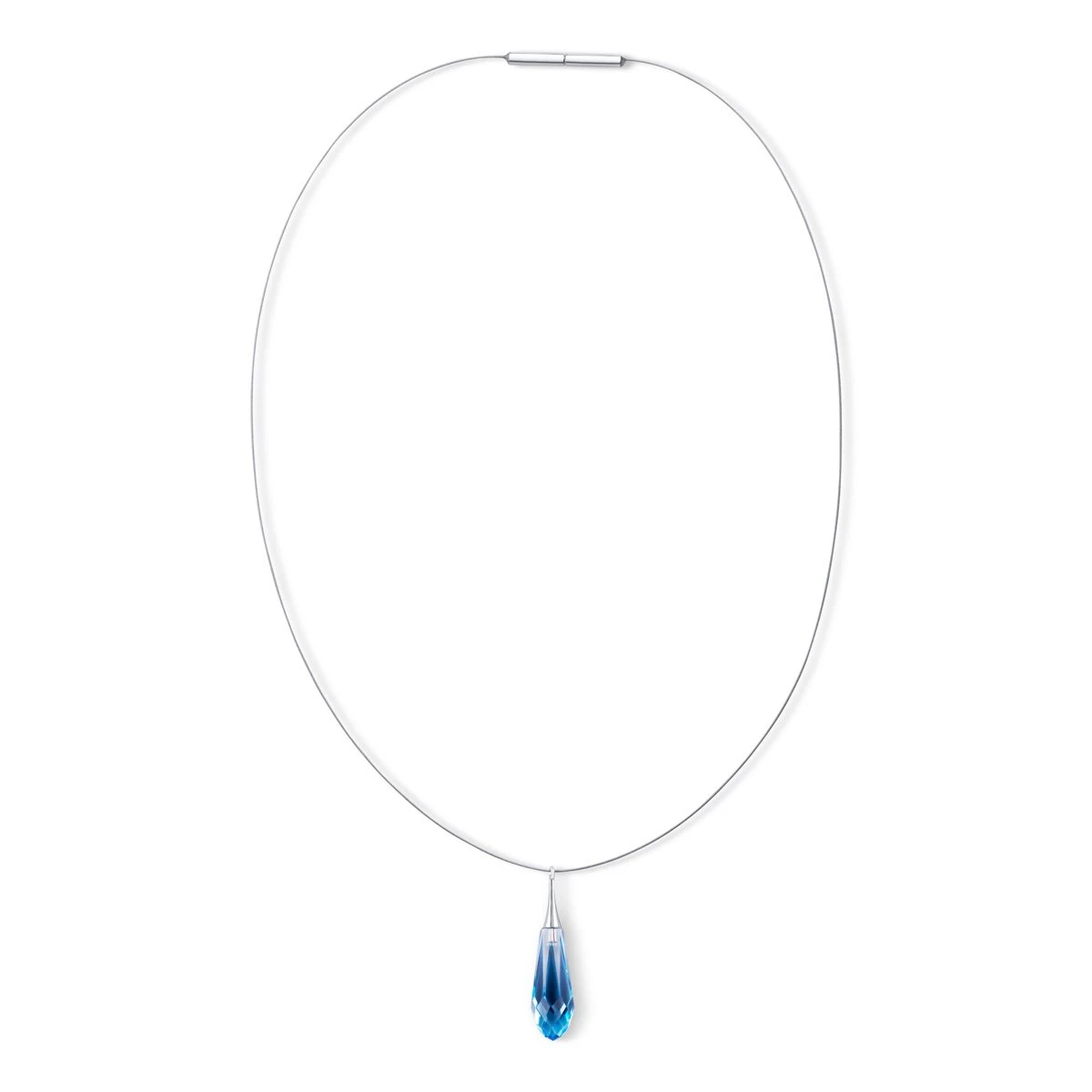 Un cristal Swarovski® richement taillé est suspendu à un mince câble presque invisible pour un rendu naturel. La forme rappelle une goutte de glace flottant dans un silence intemporel. Un bijou élégant qui attire l’attention, un must have !