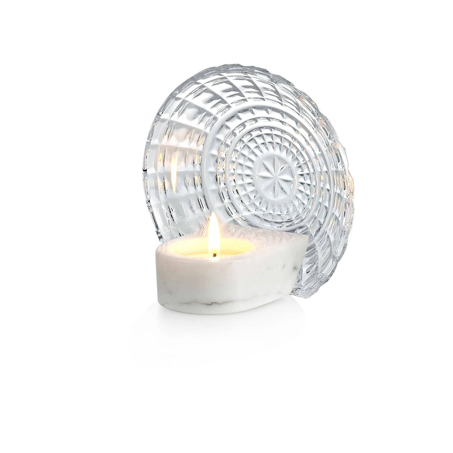 Petit objet précieux alliant la pureté du cristal et le raffinement du marbre blanc, le photophore Aura diffuse une lumière envoûtante qui capture tous les regards. La lueur de la bougie à travers le cristal fait danser le motif de