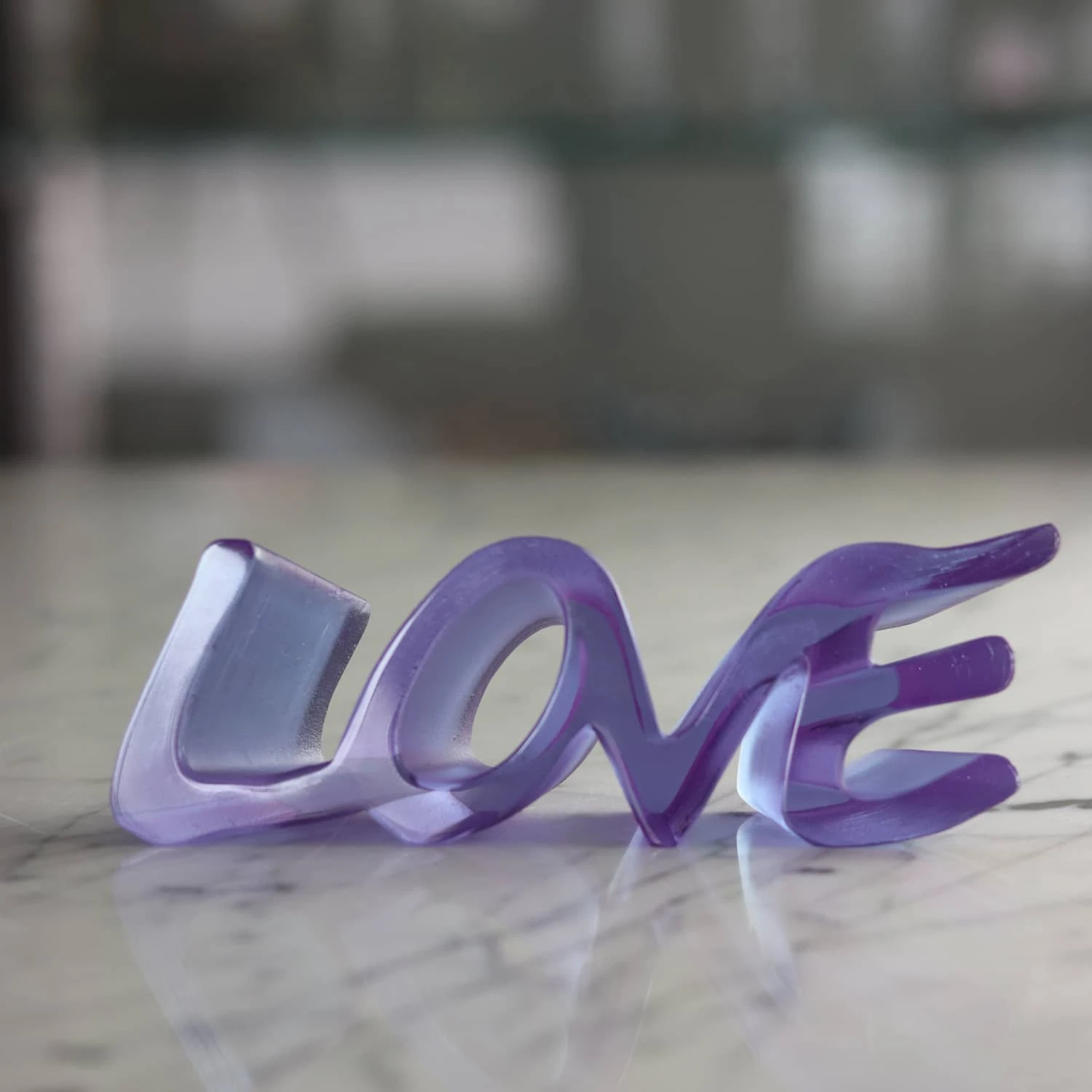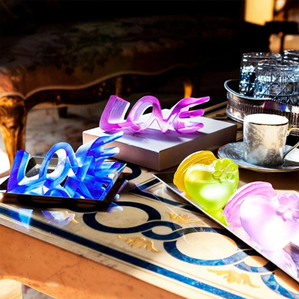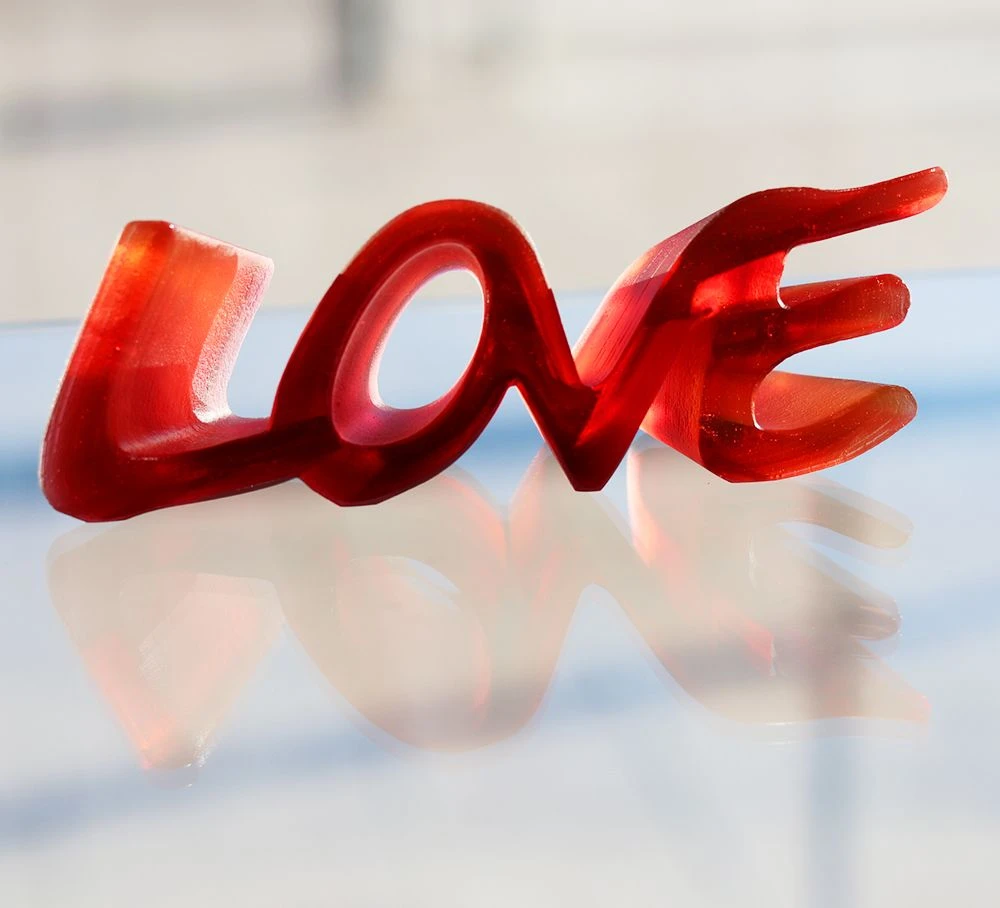 La forme de cette pièce est une référence à la puissance de son amour qui grandit graduellement, tandis que les lignes pointillées semblables à des strates, une texture spécifique de l’Amour, évoquent l’accumulation de son amour dans le temps. Les lettres arrondies conçues en majuscules sont liées les unes aux autres comme si elles démontraient un lien éternel.