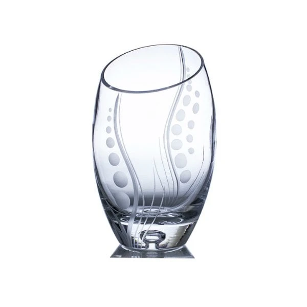 Vase présentant une coupe en biais, soufflé bouche et taillé main. Une création réalisée à GARREBOURG en France où de nombreux verriers perpétuent la tradition du taillage.