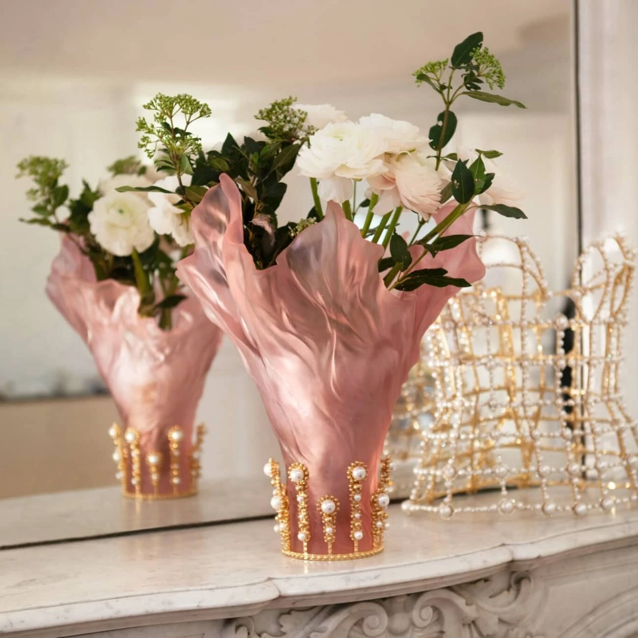 Création évoquant un tissu aérien et délicat, animé par le souffle du vent. Un accessoire en métal doré ultra raffiné, avec des perles blanches et dorées.